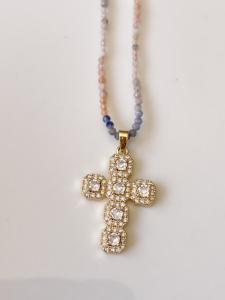Collier pierres Croix rose mauve doré