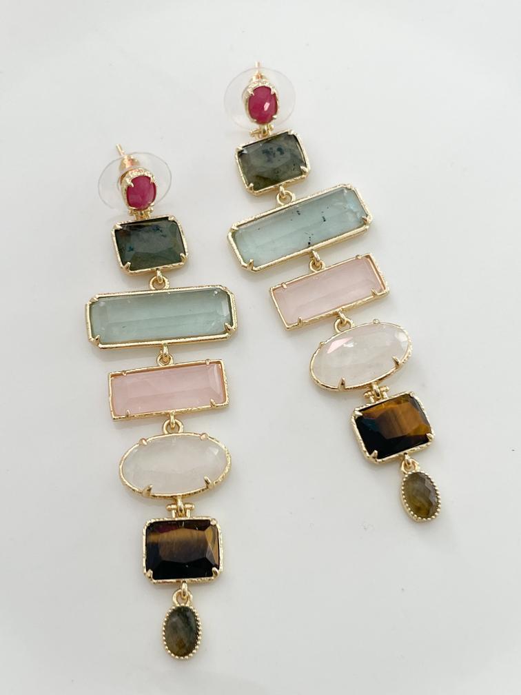 tons pastels: quartz rose, oeil de tigre, rubis zoisite