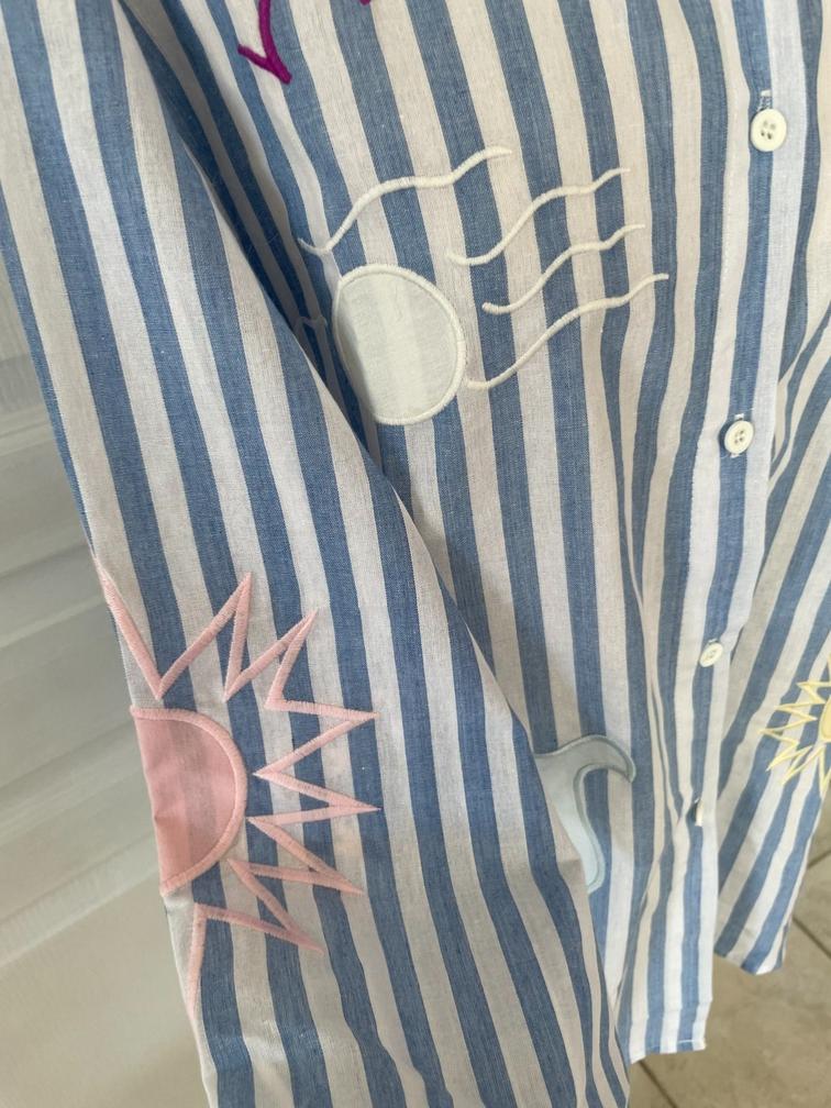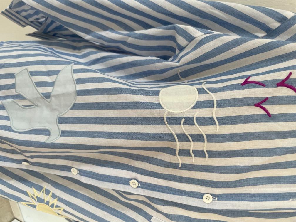 rayures blanches et bleues ou blanches et roses noeuds noirs empiecements oiseaux broderies soleil écritures plus longue derrière que devant bas arrondi