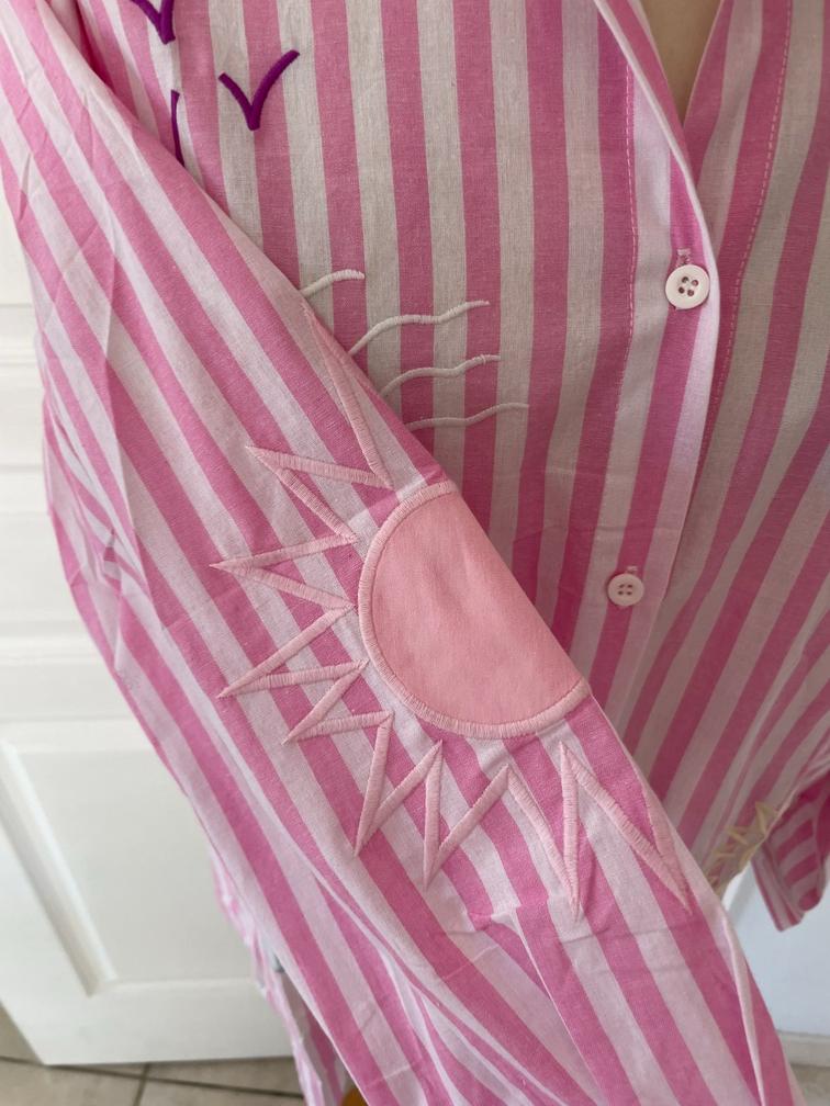 rayures blanches et bleues ou blanches et roses noeuds noirs empiecements oiseaux broderies soleil écritures plus longue derrière que devant bas arrondi