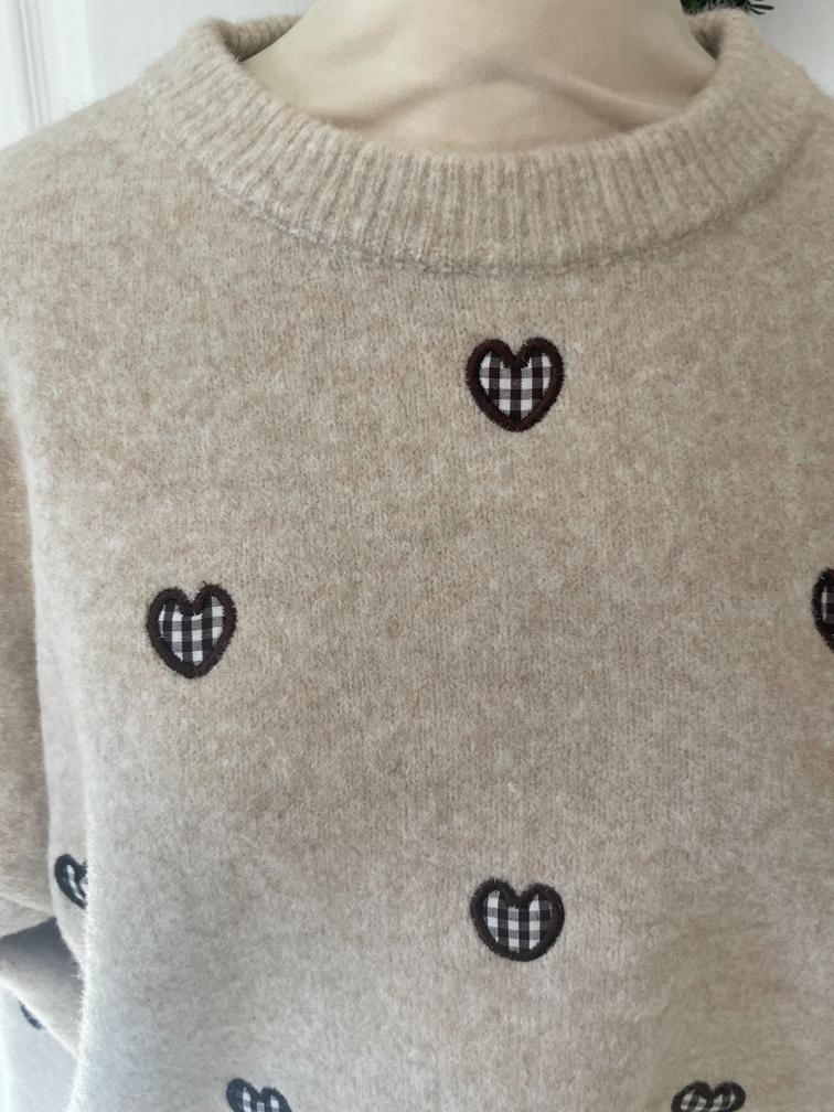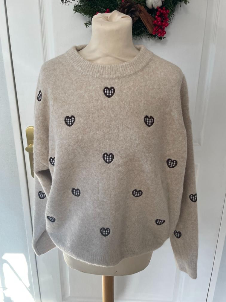 douceur incomparable col rond légérement montant beige ou marron broderies coeur tissu vichy