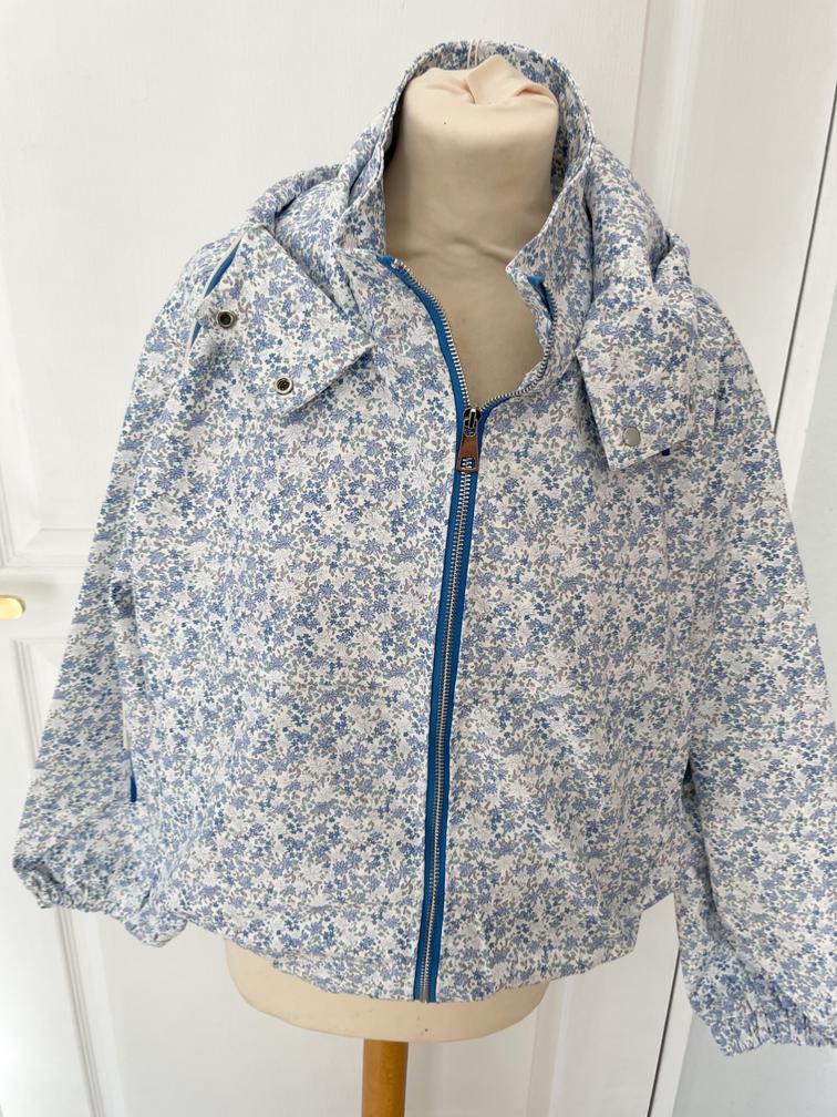 fleurs roses ou bleues déperlante capuche liens colorés fermeture éclair argenté poches côtés élastique en bas