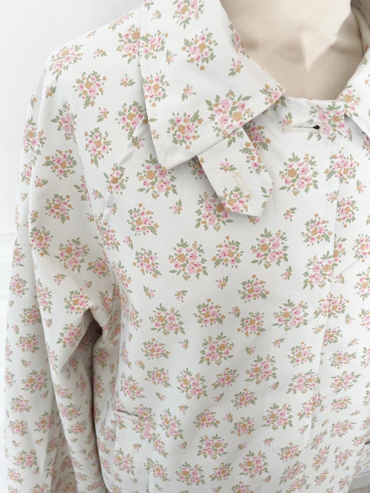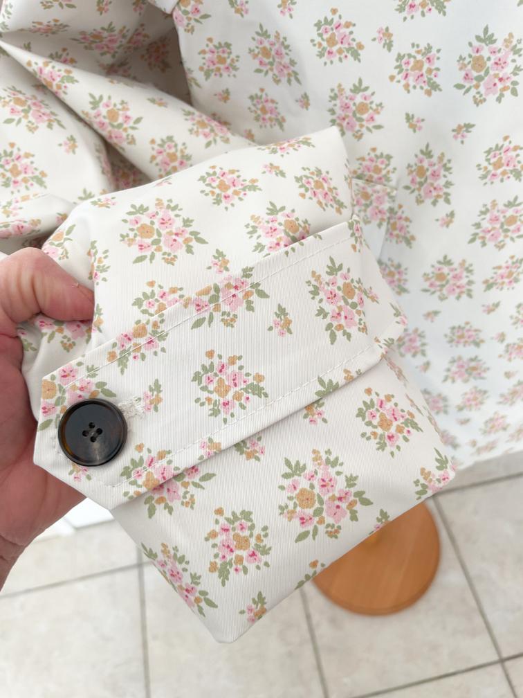 fleurs roses sur fond beige déperlante capuche amovible boutons cachés sous boutonnière poches côtés jolie bas de manches