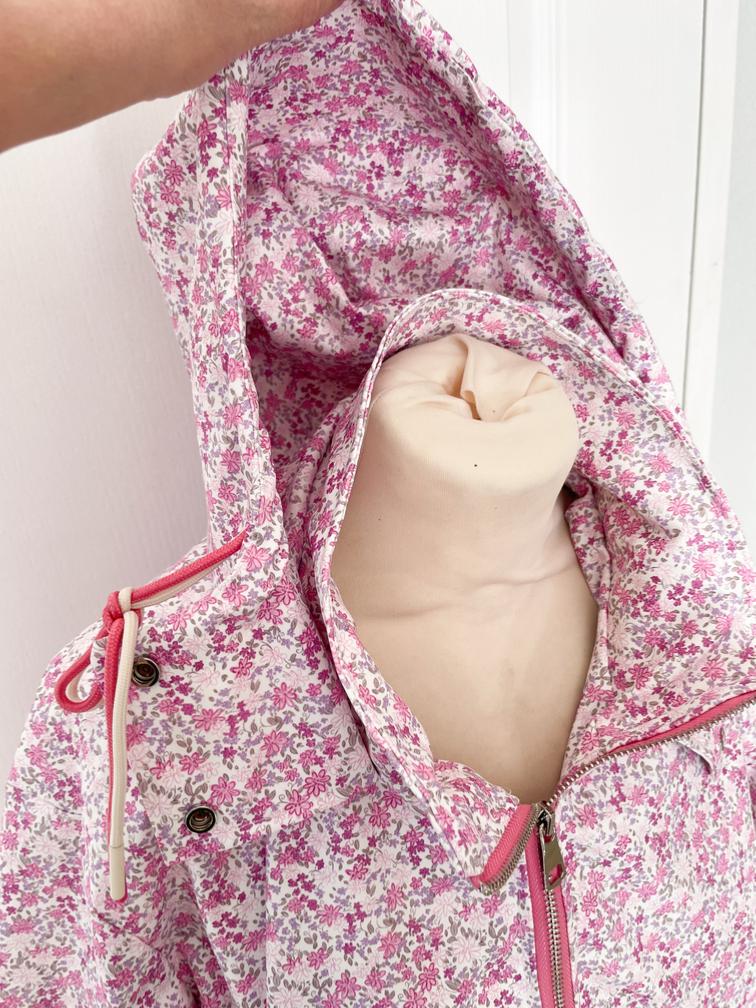 fleurs roses ou bleues déperlante capuche liens colorés fermeture éclair argenté poches côtés élastique en bas